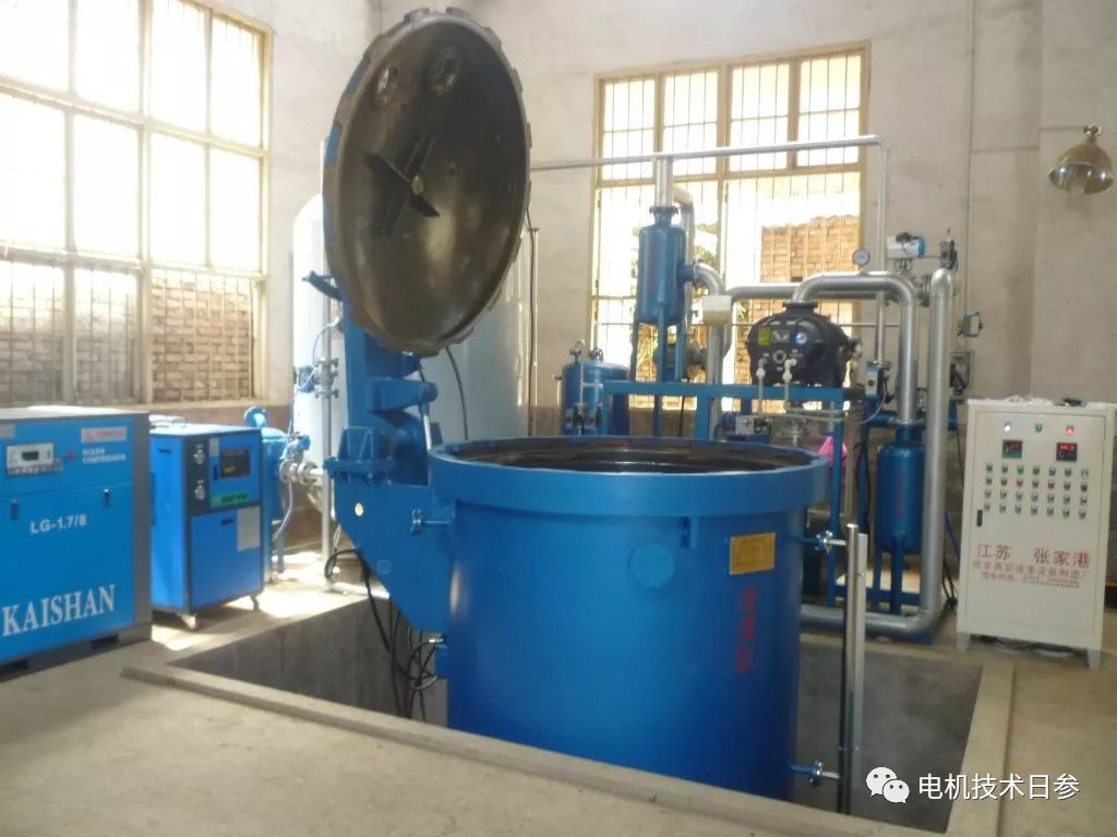 實(shí)踐證明,一次真空壓力浸漆的效果優(yōu)于二次普通浸漆。對(duì)于一些重要的電機(jī)繞組,需要使用真空壓力浸漬漆。真空壓力浸漆設(shè)備成本高,在線圈未埋入時(shí)盡量進(jìn)行;要求埋設(shè)后進(jìn)行真空壓力浸漆時(shí),盡量采用外壓結(jié)構(gòu),既能提高浸漆設(shè)備的利用率,又能避免框架帶來(lái)的灰塵污染浸漆。